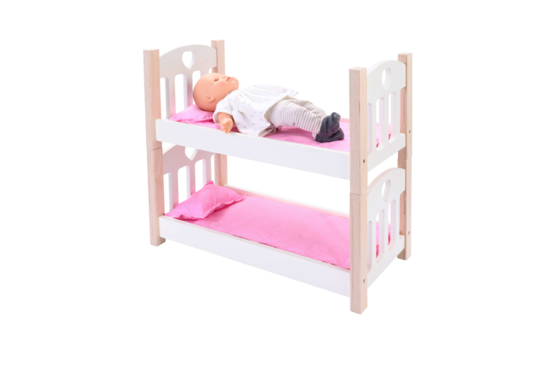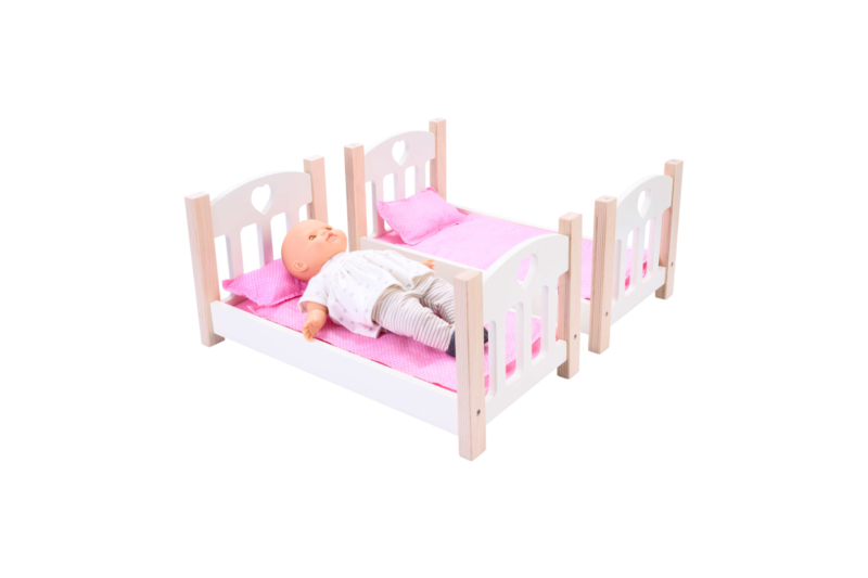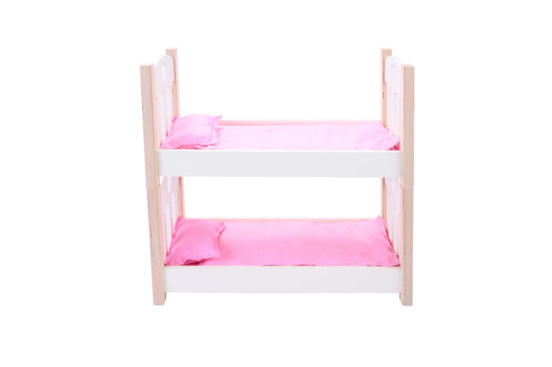 Dit geweldige houten stapelbed is uitgevoerd in een tijdloos wit design met blanco poten. Het wordt geleverd inclusief beddengoed; een matrasje, kussentje en een dekentje voor elk bed. Het stapelbed is in zijn geheel te gebruiken maar er kunnen ook 2 bedjes van gemaakt worden, je pakt heel simpel het bovenste bedje van het onderste en de poppen slapen ineens naast elkaar. De bedjes stapelen op elkaar door middel van magneten.