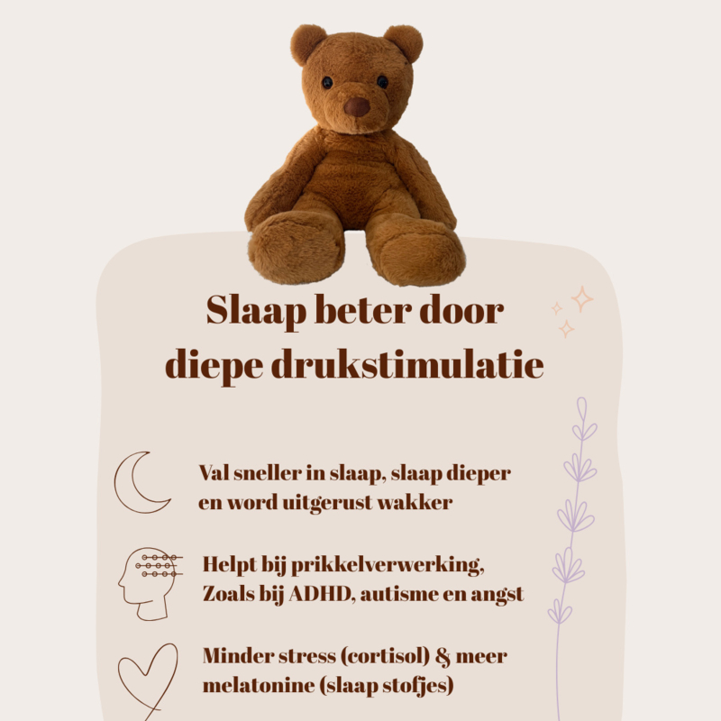 - AD(H)D: de diepe druk van de knuffel kan helpen bij overprikkeling en het bevorderen van de focus of ontspanning.
