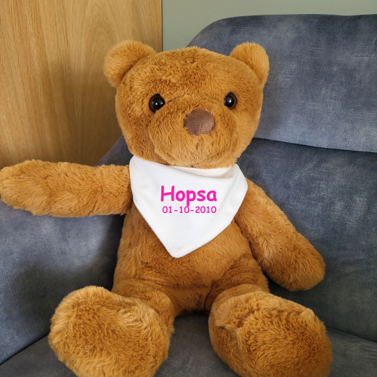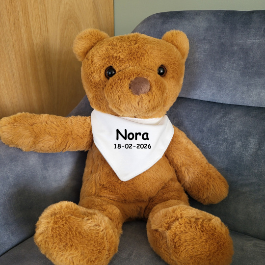 Tegen bijbetaling van €8,50 kunnen we de knuffel voorzien van sjaaltje met een naam en/of geboortedatum. Let op: gepersonaliseerd speelgoed kan niet worden geretourneerd! Let bij het invoeren van de naam en eventuele datum goed op spelling, het wordt 1 op 1 overgenomen en kan later niet worden gewijzigd. We streven er naar gepersonaliseerde artikelen binnen 4 werkdagen te versturen.