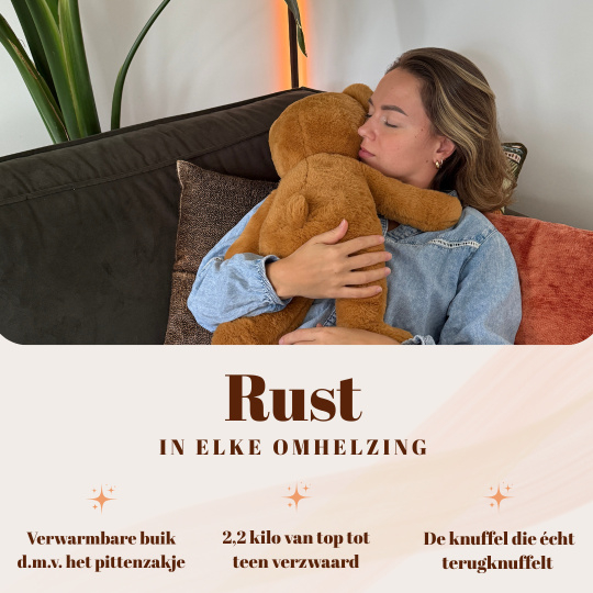 - Menstruatieklachten en endometriose: bij buikpijn of een opgejaagd gevoel tijdens de menstruatie kan het gewicht (en de warmte) van de knuffel zorgen voor verlichting en rust. Veel mensen ervaren het als prettig om de knuffel op de onderbuik te leggen of stevig tegen zich aan te drukken.